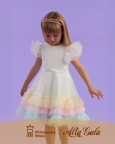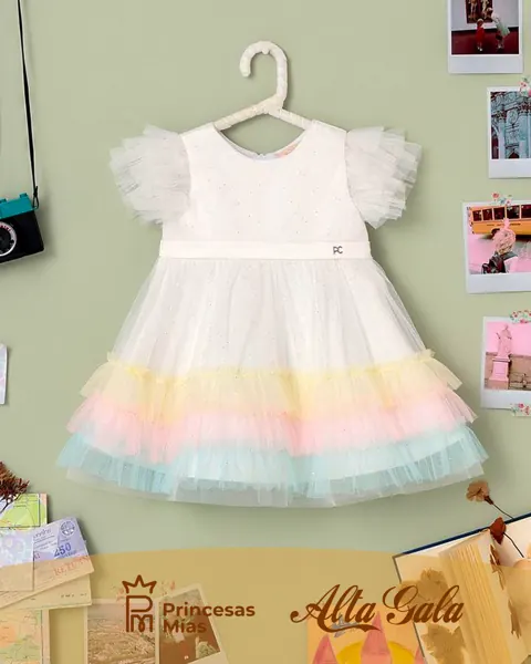 Un diseño delicado y encantador pensado para las más pequeñas. Este vestido exclusivo de la marca Petit Cherie combina la elegancia del blanco con volados de tul en suaves tonos pastel. La parte superior lleva un sutil brillo que ilumina cada movimiento, mientras que las mangas abullonadas de tul aportan un toque mágico. Características: Diseño exclusivo con detalles brillantes Mangas tipo tul abullonadas Volados en tonos pastel (amarillo, rosa, celeste) Corte clásico y cómodo Ideal para eventos especiales y sesiones de fotos Recomendado para: cumpleaños, bautismos, celebraciones familiares, fiestas de ensueño.