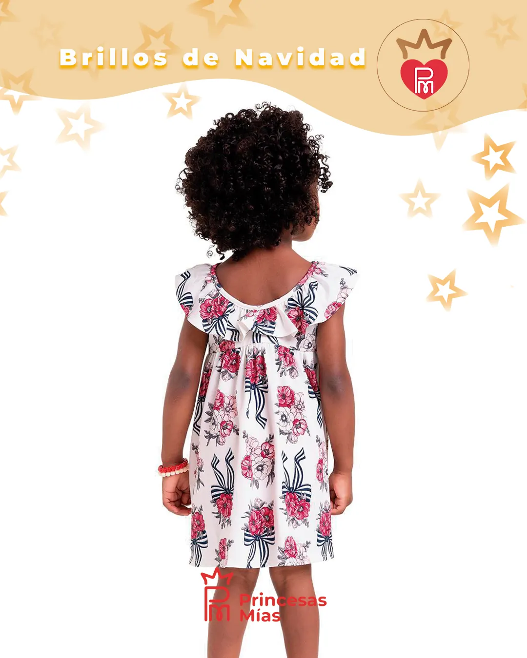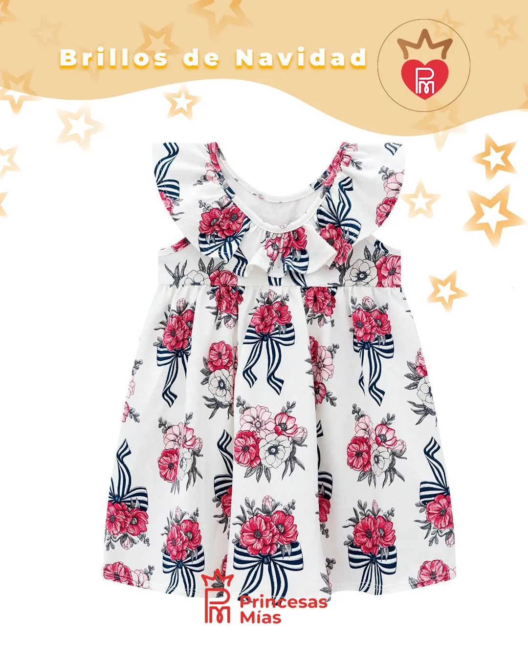 Vestido floral 100% algodón con volados Este vestido floral de algodón 100% es perfecto para las peques que necesitan comodidad sin perder estilo. Su tejido natural es suave, respirable y liviano, ideal para los días de calor, reuniones familiares y celebraciones especiales. El diseño trae un estampado de flores rojas con lazos en tono azul marino sobre fondo blanco, creando un look delicado y elegante Y El tiffany de fondo con flores rosas con moños azules. Las mangas con volados y el detalle fruncido en el pecho le dan movimiento y un toque muy infantil, haciendo que el vestido se vea precioso tanto en fotos como en el día a día. Es una opción versátil: se puede usar en Navidad, Año Nuevo, cumpleaños, salidas de verano y eventos escolares, siempre con la comodidad del algodón puro. Combinándolo con nuestros calzados, moños, vinchas y accesorios de Princesas Mías, puedes armar un conjunto completo y encantador. Ficha técnica Marca: Milon Modelo: Vestido floral con volados Tipo de prenda: Vestido infantil casual/festivo Color base: Blanco y tifanny Estampa: Flores rojas y lazos en azul marino Tela: Tejido plano de algodón Composición: 100% algodón Detalles de diseño: Escote redondo Mangas con volados Detalle fruncido/volado en el pecho Falda con vuelo suave, largo a la rodilla