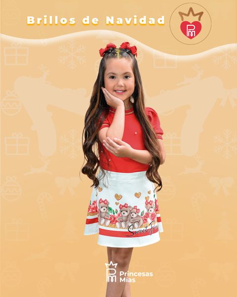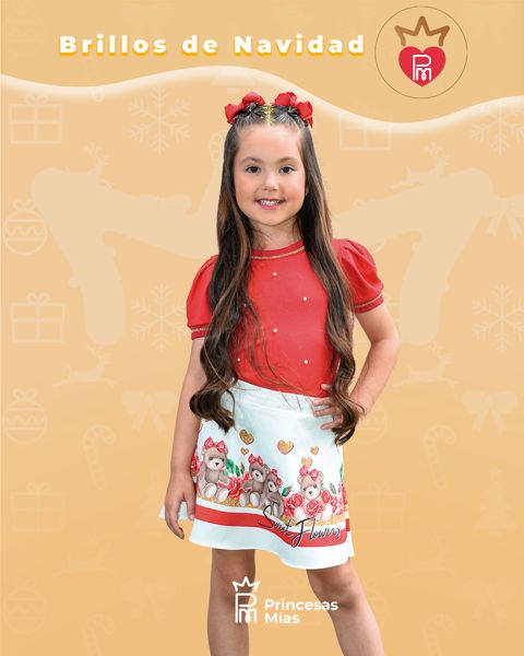 Conjunto Kukiê: blusa y falda. Blusa con detalles de perlas, mangas princesa y detalles dorados en cuello y mangas. Falda con detalles rojos y dorados con serigrafia. Shorth corto incorporado. (Short escondido) composición: Blusa: 98 % poliéster, 2 % elastano