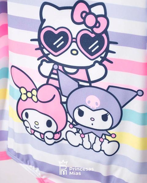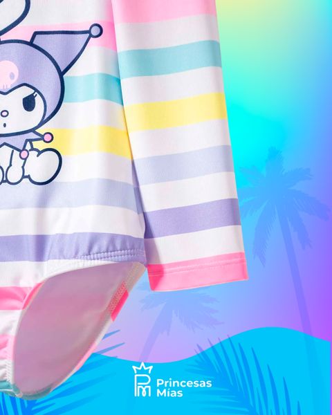 Este traje de baño Hello Kitty está pensado para veranos largos, juegos con agua y muchas fotos lindas. Su diseño enterizo con manga larga ofrece una cobertura extra, ideal para cuidar la piel mientras tu pequeña juega bajo el sol. Además, cuenta con protección solar UV50, que ayuda a bloquear los rayos dañinos y da un plus de tranquilidad a las mamás. El estampado de rayas multicolor y los personajes más queridos (Hello Kitty y sus amigas) hacen que la prenda sea pura dulzura y diversión. El tejido es suave, con buen calce, pensado para que pueda nadar, correr y chapotear sin molestias.