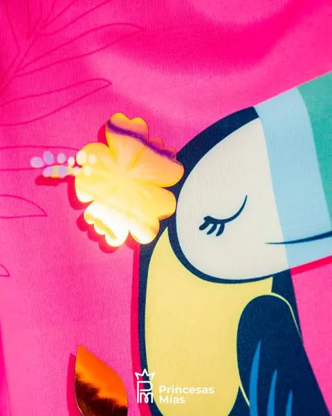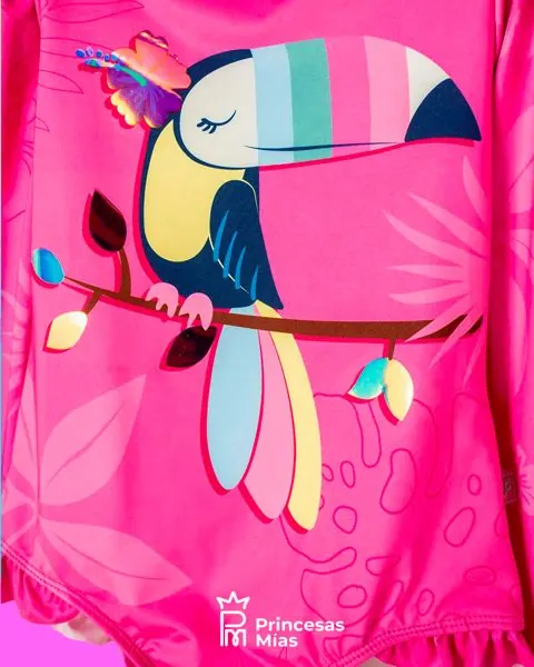 ¡A volar entre las olas! Este traje de baño entero de manga larga es ideal para pequeñas aventureras que aman el agua y el sol. Su color rosa vibrante y el simpático tucán tropical le dan un toque súper alegre, mientras que su diseño cómodo acompaña cada juego en la piscina, el mar o en casa. Y lo mejor: cuenta con protección solar UV 50 para mayor tranquilidad en los días de calor. Detalles: Traje de baño entero. Mangas largas para mayor cobertura. Estampado tropical con tucán. Diseño cómodo y suave al tacto. Ideal para piscina, playa o juegos bajo el sol. Protección solar UV 50. Composición: 85% poliéster, 15% elastano. Forro: 87% poliéster, 13% elastano.