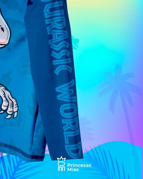 ¡Al agua, dinosaurios! Este traje de baño es perfecto para que tu peque se sienta parte de la manada mientras nada. Su camiseta manga larga con estampado jurásico lo protegerá del sol con todo el estilo del parque más famoso del cine, y su bóxer en tela elástica se encargará de que se mueva con confianza. ¡Para que la diversión siga sin pausa! Ideal para vacaciones salvajes o tardes de piscina. Y cuenta con protección solar UV 50. Composición: 85% poliéster, 15% elastano. Bóxer: 85% poliéster, 15% elastano. Forro: 87% poliéster, 13% elastano.