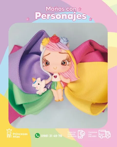 Un moño lleno de color y ternura 💕. Esta combinación arcoíris mezcla tonos vibrantes y alegres que hacen que cualquier look se sienta más divertido y especial 🌈🎀. La muñequita central con estilo fantasy le da ese toque de “wow” que encanta a las peques y convierte el accesorio en protagonista ✨. Accesorios infantiles hechos a mano con amor, delicadeza y encanto. 💖 ¡Cada lazo lleva cuidado, calidad y un toque especial que transforma cada momento en magia! 🎀
