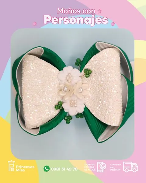 Descripción corta: Moño verde esmeralda 💚✨ con brillo blanco tipo glitter 🤍 y detalles florales con perlitas 🌼🤍 un diseño elegante y delicado que ilumina cualquier look con un toque romántico y súper fino 🎀💫 Accesorios infantiles hechos a mano con amor, delicadeza y encanto. 💖 ¡Cada lazo lleva cuidado, calidad y un toque especial que transforma cada momento en magia! 🎀